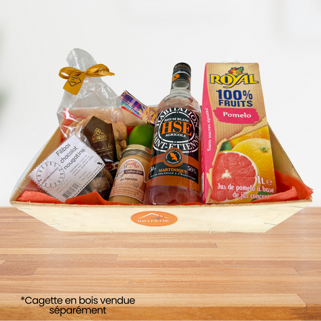Le panier Karayb célèbre la richesse des saveurs et la chaleur des moments partagés. Il contient 4 à 6 produits généreux, comprenant deux boissons (une alcoolisée  50cl et une soft), un plaisir croquant, des épices et d’autres trésors artisanaux à découvrir 🍹