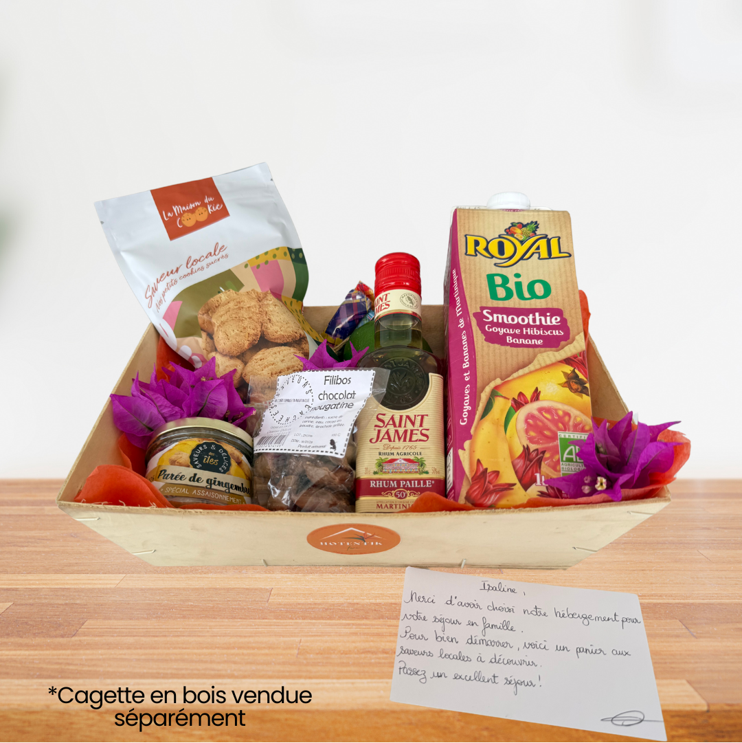 Solèy, c’est la générosité en format compact : 4 à 6 produits locaux, comprenant deux boissons (une alcoolisée et une soft), un plaisir croquant, des épices, et des petites douceurs créoles… Tout ce qu’il faut pour démarrer le séjour dans la bonne humeur !